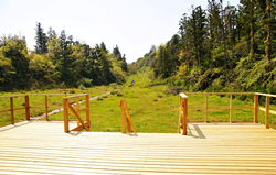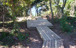 仮説桟橋から上陸。簡易階段を登り頂上へ。散骨は頂上の木道で行います。